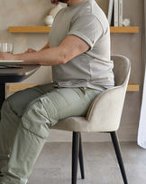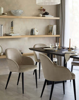 The Lani champagne velvet dining chair brings sophisticated comfort to every meal. Sold in pairs, these beautifully curved chairs feature plush velvet upholstery and supportive armrests that invite long dinners and lingering conversations. The sleek black metal legs create a striking contrast, making them versatile enough to complement both contemporary and traditional dining tables.