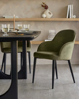 Stylish green velvet chairs with black legs around a modern dark wood dining table; minimal decor on wooden shelves above.