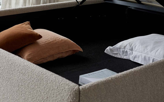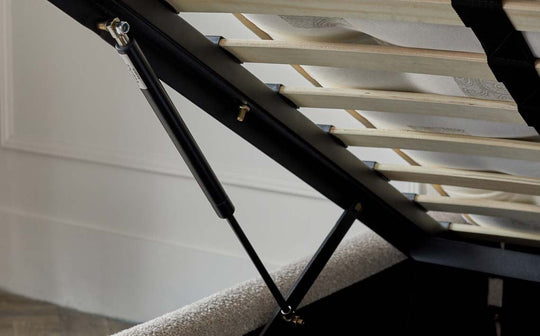 The Lani king ottoman bed combines contemporary style with clever storage solutions. Upholstered in soft, natural boucle fabric, its curved headboard creates an inviting focal point for your bedroom. Beneath the mattress, powerful hydraulic pistons reveal generous ottoman storage - perfect for bedding, blankets and seasonal essentials. A practical choice for any bedroom, particularly where space is at a premium.