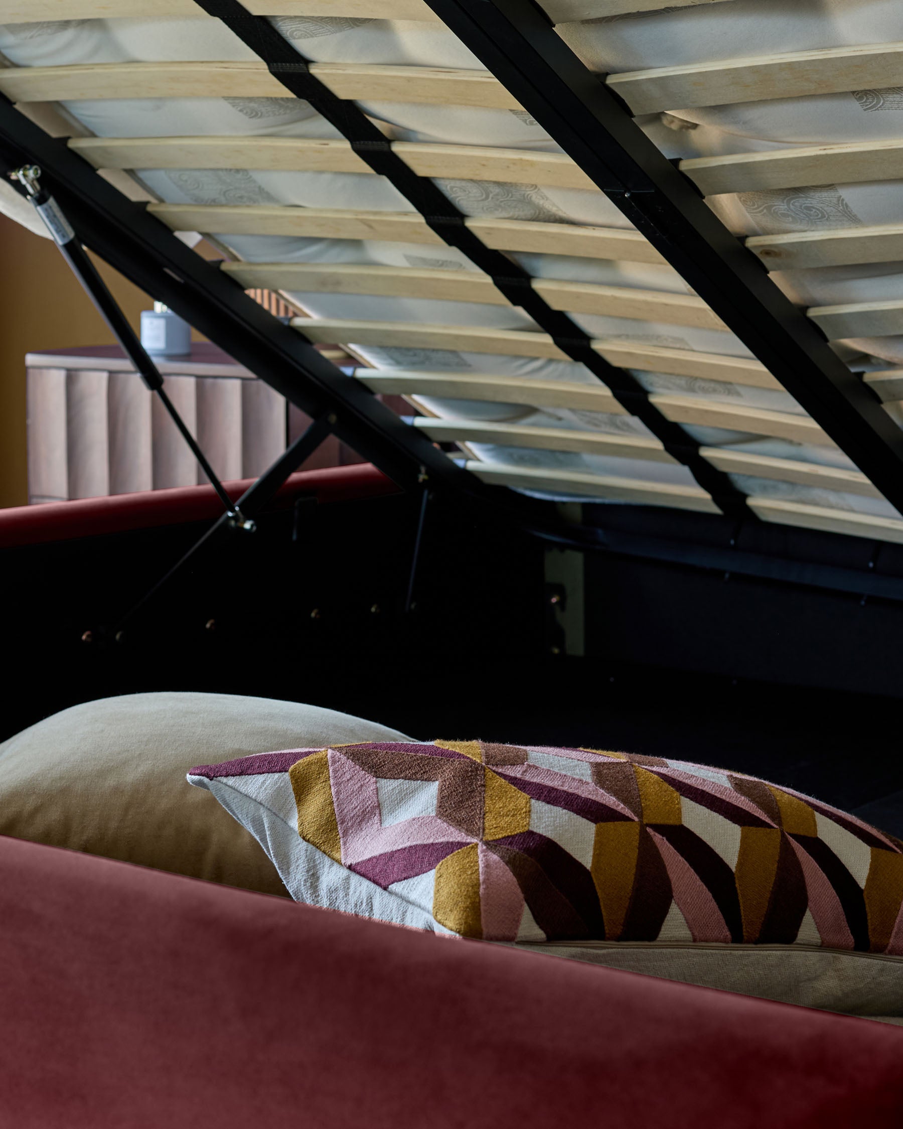 The Lani plum velvet king size ottoman bed brings rich colour and clever storage to your bedroom. Upholstered in sumptuous recycled velvet, its deep plum tone and curved headboard create an inviting focal point. Beneath lies spacious ottoman storage accessed via smooth hydraulic pistons - perfect for bedding, blankets and those bulky essentials that need a home.