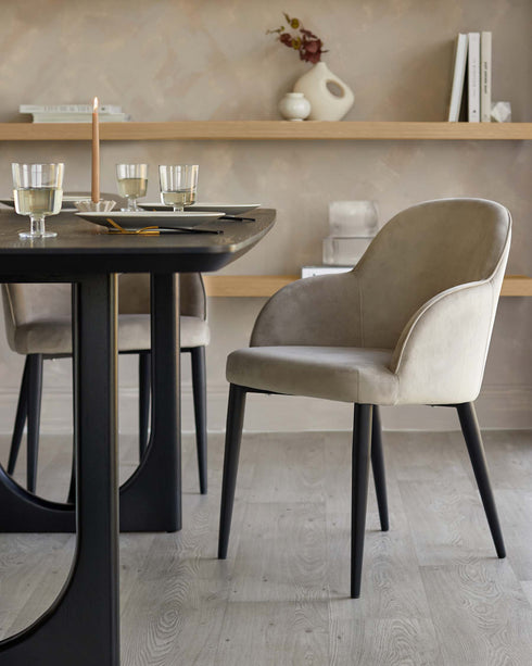 The Lani champagne velvet dining chair brings sophisticated comfort to every meal. Sold in pairs, these beautifully curved chairs feature plush velvet upholstery and supportive armrests that invite long dinners and lingering conversations. The sleek black metal legs create a striking contrast, making them versatile enough to complement both contemporary and traditional dining tables.