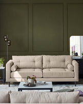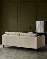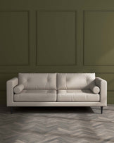 A modern light beige three-seater sofa with clean lines and a minimalist design, featuring cylindrical armrests, cushioned back and seat, and raised on dark tapered legs. The sofa is set against a dark green wall with wall panelling details, and rests upon a herringbone-patterned wooden floor.