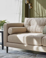 Beige fabric sofa with a modern minimalist design featuring clean lines, a single cylindrical bolster pillow, thick seat cushion, and slender black metal legs.
