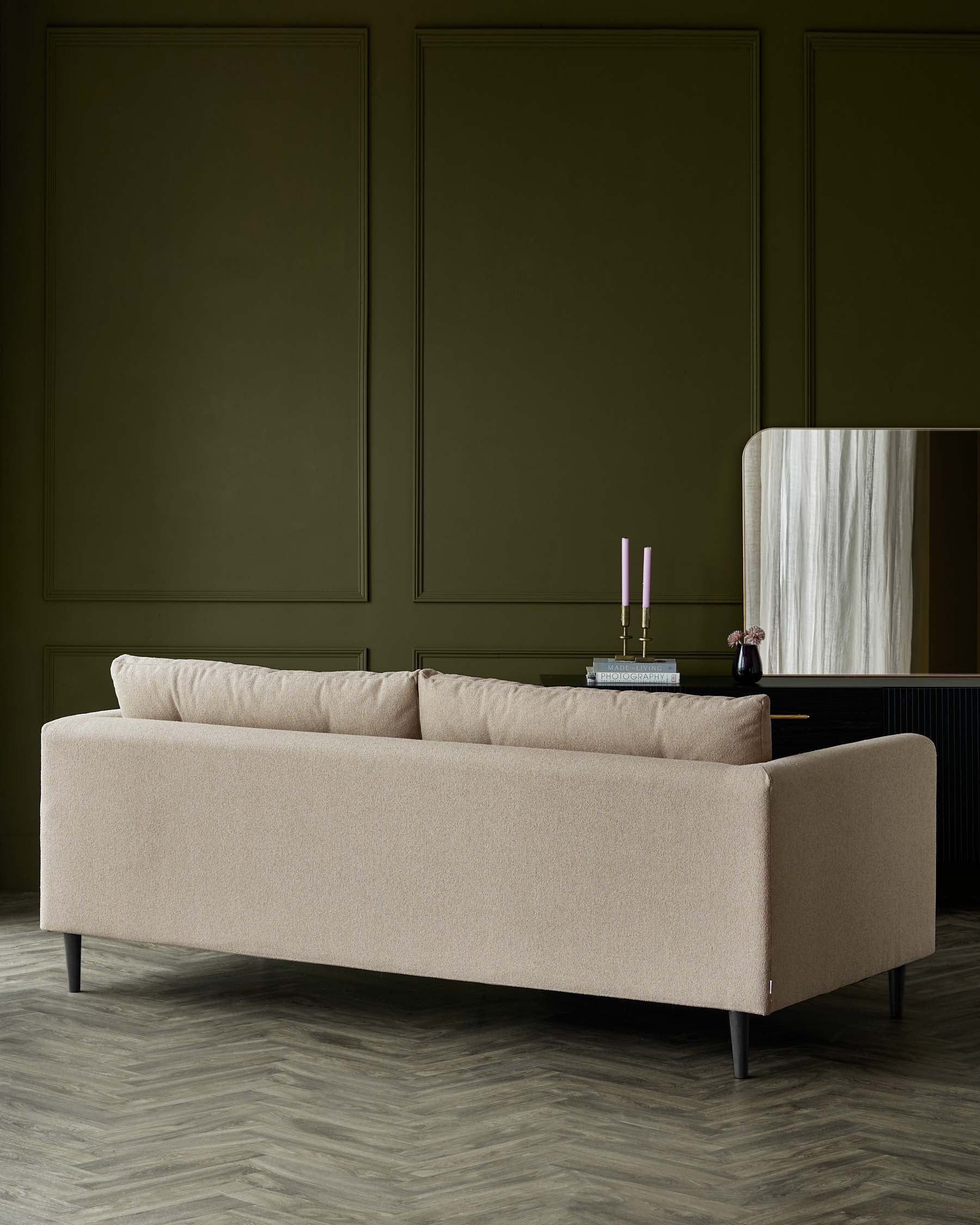 A modern sand-coloured fabric sofa with clean lines and minimalist design on dark wood legs, set against a dark green panelled wall. A wood sideboard with rounded corners and a white front panel is partially visible to the right with a candlestick holder and a small vase on top.