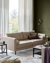 A modern beige three-seater sofa with clean lines, cylindrical cushions, and square armrests, set in a living room. A mid-century modern style floor lamp with spherical shades stands to the left. A rectangular grey coffee table with a white top displaying decorative items and books is in the foreground. Behind the sofa, a black sideboard with tapered legs and dark purple candles on top completes the scene, all against a wall with green panelling.