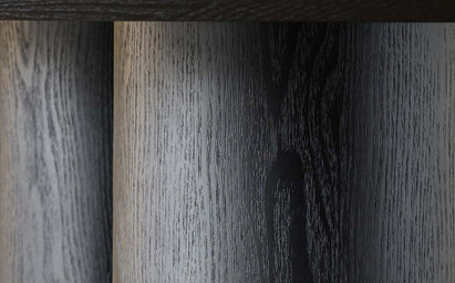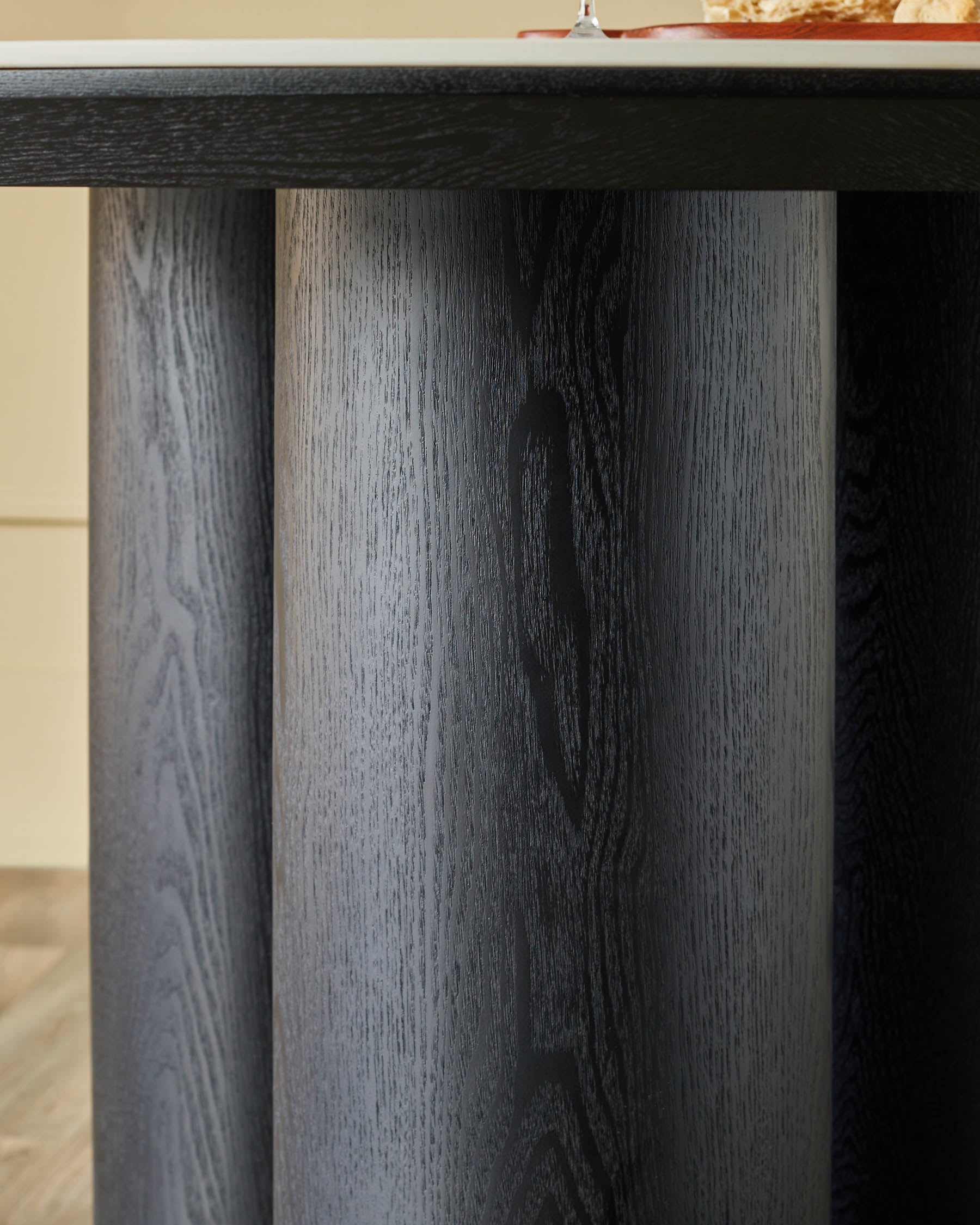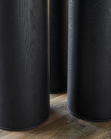 Close-up of a dark wooden table with cylindrical legs, showcasing the wood grain detail and modern design.