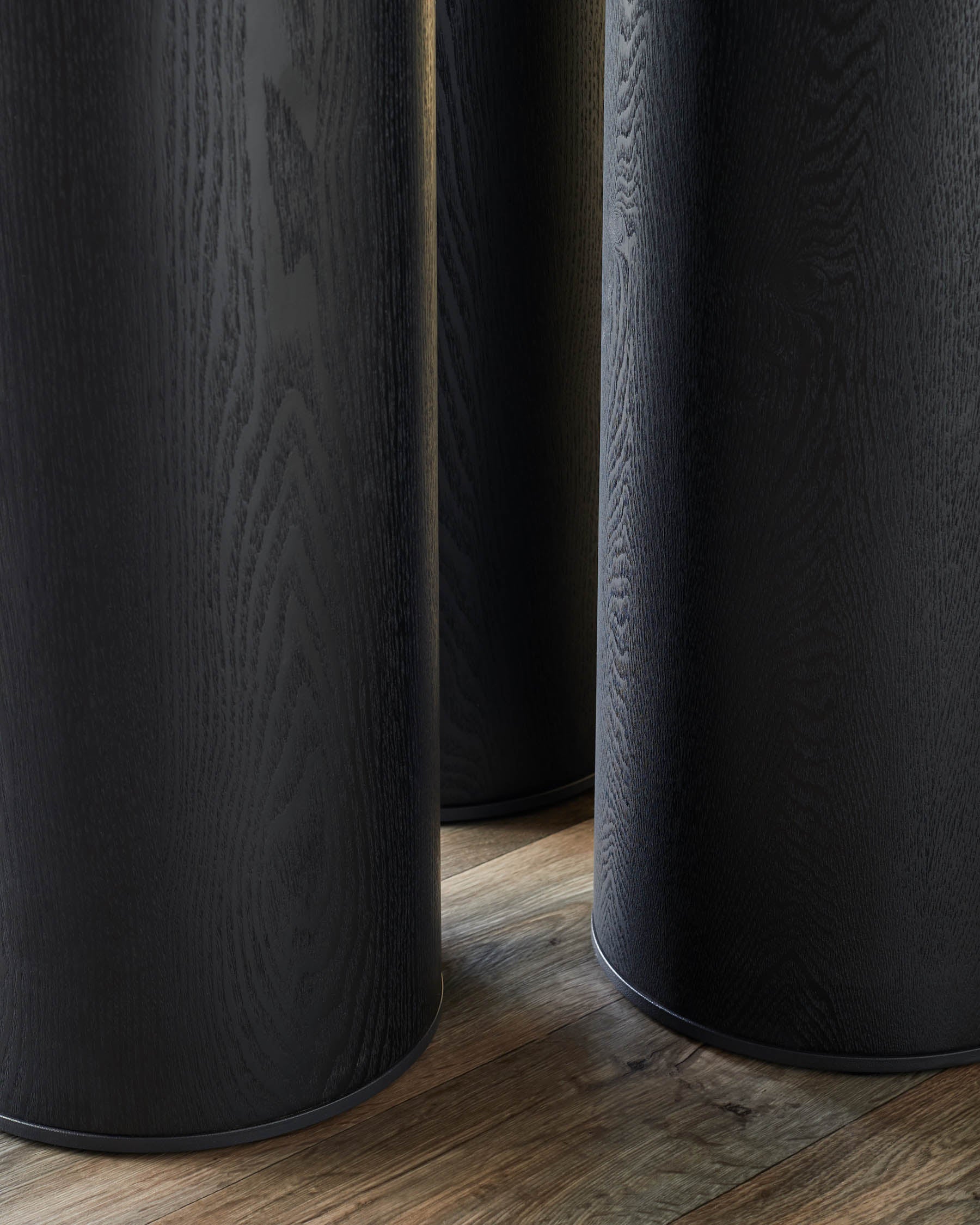 Three dark wood tables with a cylindrical design and a dark wood grain finish on a wooden floor.
