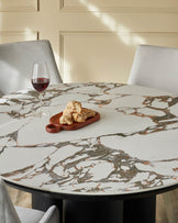 A close up shot of a round dining table with a marble top and a dark wood base, featuring wine and bread on a wooden platter.