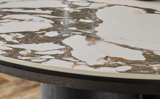 The Lena white calacatta ceramic 4 seater dining table brings sophisticated style to smaller spaces without compromise. Its striking marble-effect ceramic top features warm redder tones with a matt finish, while the distinctive three-pillar pedestal base offers both visual interest and rock-solid stability. Perfect for intimate dinners or morning coffee, this compact yet commanding piece seats 4 comfortably.