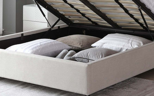 The Lenora cream fabric super king size ottoman storage bed combines sophisticated style with clever storage solutions. Its tall, winged headboard with elegant button detailing creates an impressive focal point, while the luxuriously soft cream fabric adds warmth to any bedroom. Beneath the mattress, spacious ottoman storage accessed via durable hydraulic pistons provides the perfect hiding place for extra bedding and blankets.