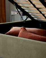 Transform your bedroom with the Lenora olive green velvet super king size ottoman storage bed - where sophisticated style meets smart storage. The lift-up ottoman base reveals generous hidden storage for bedding, blankets and seasonal items, while the rich olive green recycled velvet upholstery brings warmth and texture to your space. Powerful hydraulic pistons ensure smooth, effortless opening every time.