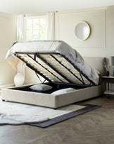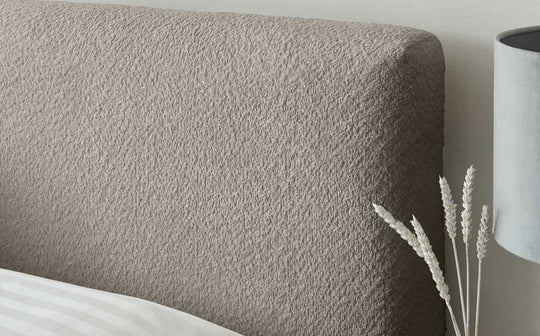 Transform your bedroom with the Leona Natural Soft Boucle double ottoman bed. This thoughtfully designed piece combines contemporary style with clever storage, featuring a tall cushioned headboard that's perfect for lazy Sunday mornings with coffee and a book. The on-trend boucle fabric adds warmth and texture, while the spacious hidden storage keeps your space beautifully uncluttered.