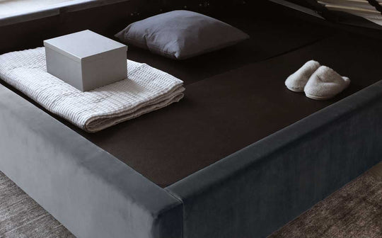 The Leona dark grey velvet king size ottoman storage bed combines luxury and practicality in one sophisticated design. Its tall, double-cushioned headboard creates an inviting focal point, while the hidden ottoman storage compartment provides 15cm of space for bedding, blankets and seasonal items. Supported by sprung slats and webbing for superior comfort, this bed offers both style and smart storage solutions for modern bedrooms.