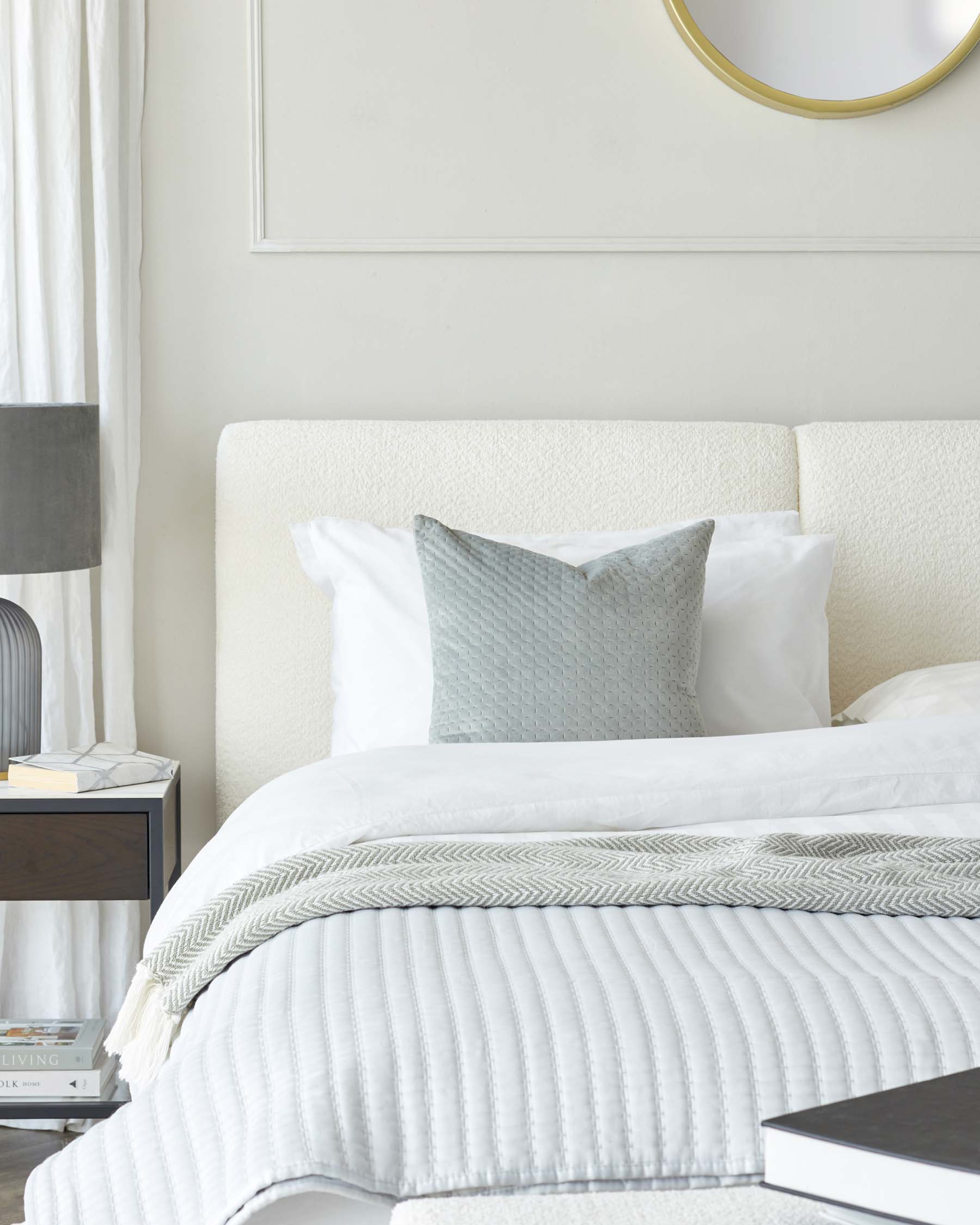 Close-up of a stylish bed with a textured headboard, soft pillows, and a cosy blanket for a serene bedroom setting.