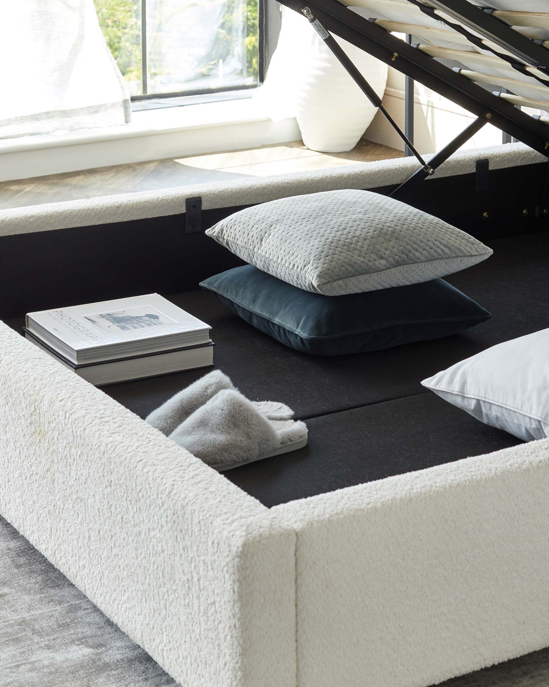 The Leona super king ottoman bed brings together smart storage and sophisticated style. Its tall, cushioned headboard creates the perfect backdrop for lazy Sunday mornings, while ivory soft boucle fabric adds texture and warmth to your bedroom. Beneath the spacious super king frame lies generous hidden storage - 15cm deep - accessed via smooth hydraulic pistons that make tidying bedding and blankets effortless.