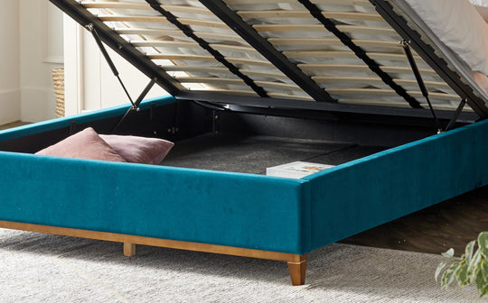 The Libby teal velvet king size bed makes a statement with its tall, deep-buttoned headboard, upholstered in a rich, soft velvet. This luxurious fabric adds a touch of opulence to any bedroom. Practicality meets style with generous under-bed storage, easily accessible thanks to a durable hydraulic system. Sprung slats and webbing ensure a comfortable night's sleep, while the adjustable centre support provides added stability. Style the Libby with crisp white bedding, coordinating teal cushions and throws, and a pair of sleek bedside tables topped with elegant lamps to create a tranquil and inviting space. Complete the look with a supportive and comfortable mattress for the perfect night's sleep.Details