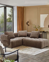 The Lillian mocha fabric right hand small corner chaise sofa brings gentle curves and fluted arms to create an inviting centrepiece for your living room. Wrapped in rich mocha chenille upholstery, this compact corner sofa features a right-hand chaise perfect for stretching out after long days. The warm mocha tone works beautifully with both neutral and bold colour schemes.