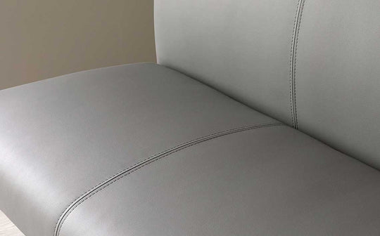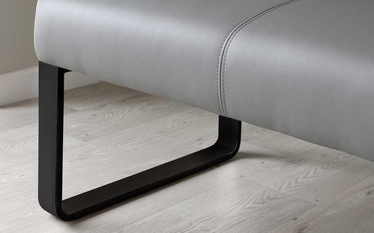 The Loop 3 seater bench brings contemporary style and practical comfort to your dining space. Upholstered in smooth mid grey faux leather with a supportive backrest, this bench seats 3 comfortably while its sleek black metal legs create a modern silhouette. Perfect for breakfast nooks, dining rooms or anywhere you need flexible seating that doesn't compromise on style.