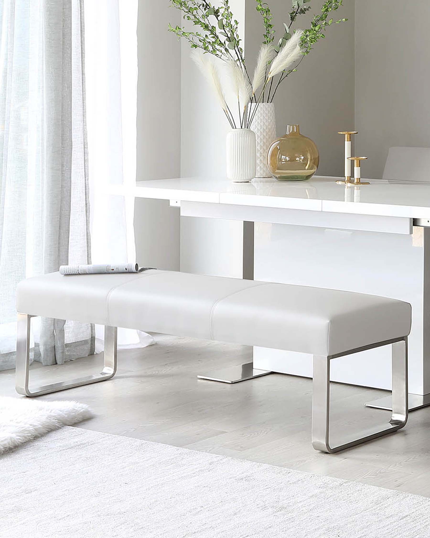 The Loop 3 seater bench brings sophisticated simplicity to your dining space or hallway. Upholstered in smooth light grey faux leather with a sleek backless design, it seats 3 comfortably while maintaining a light, airy feel. The brushed stainless steel legs add contemporary elegance, making this versatile piece perfect for modern dining rooms or as stylish entryway seating.