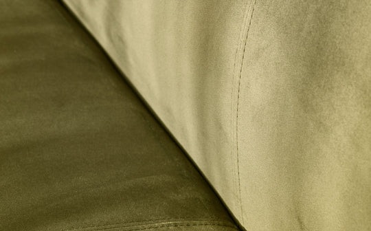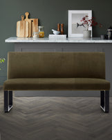 The Loop olive green velvet 3 seater dining bench brings sophisticated comfort to your dining space. Upholstered in rich olive green recycled velvet with generous padding and a supportive backrest, it seats three comfortably. The distinctive black metal loop legs create visual interest while providing sturdy support for relaxed meals and long conversations around the table.