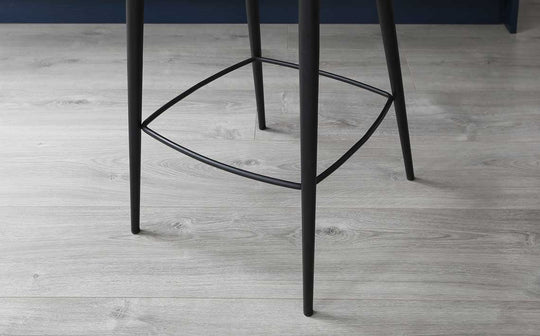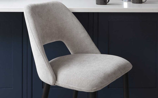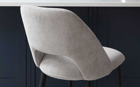 The Lottie mid grey fabric bar stool brings contemporary style to your breakfast bar or kitchen island. Upholstered in soft, durable chenille fabric with a curved backrest and distinctive cutout detail, it offers comfort for morning coffee or evening drinks. The sleek powder-coated steel legs create a modern silhouette that works beautifully in any contemporary kitchen.