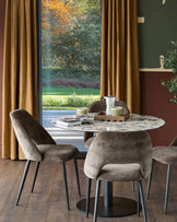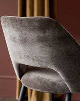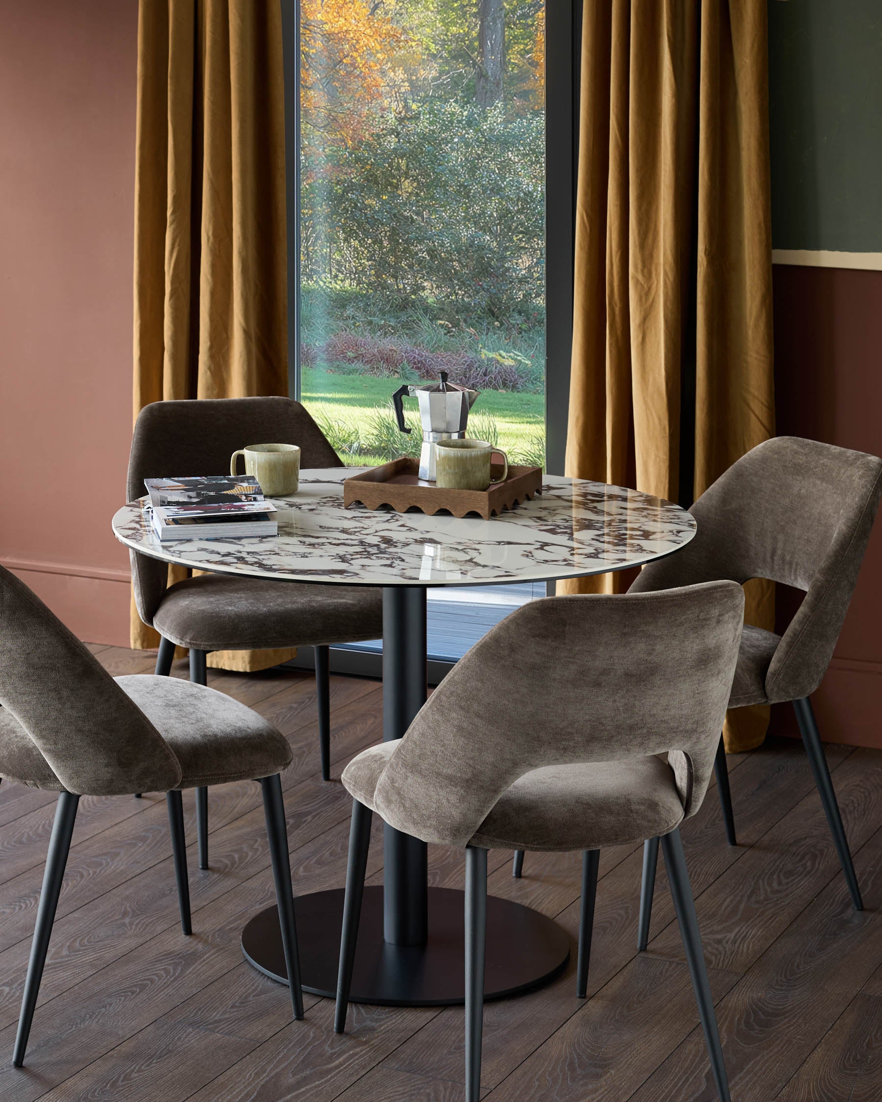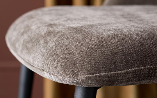The Lottie mocha fabric dining chair brings comfort and style to your dining space with its inviting chenille upholstery in a warm mocha tone. The gently curved backrest and contemporary open-back design create an airy feel, while slender black metal legs add modern sophistication. Perfect for long dinner parties or quick morning coffees.