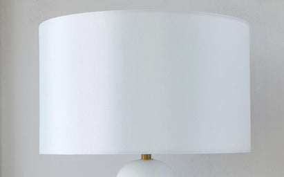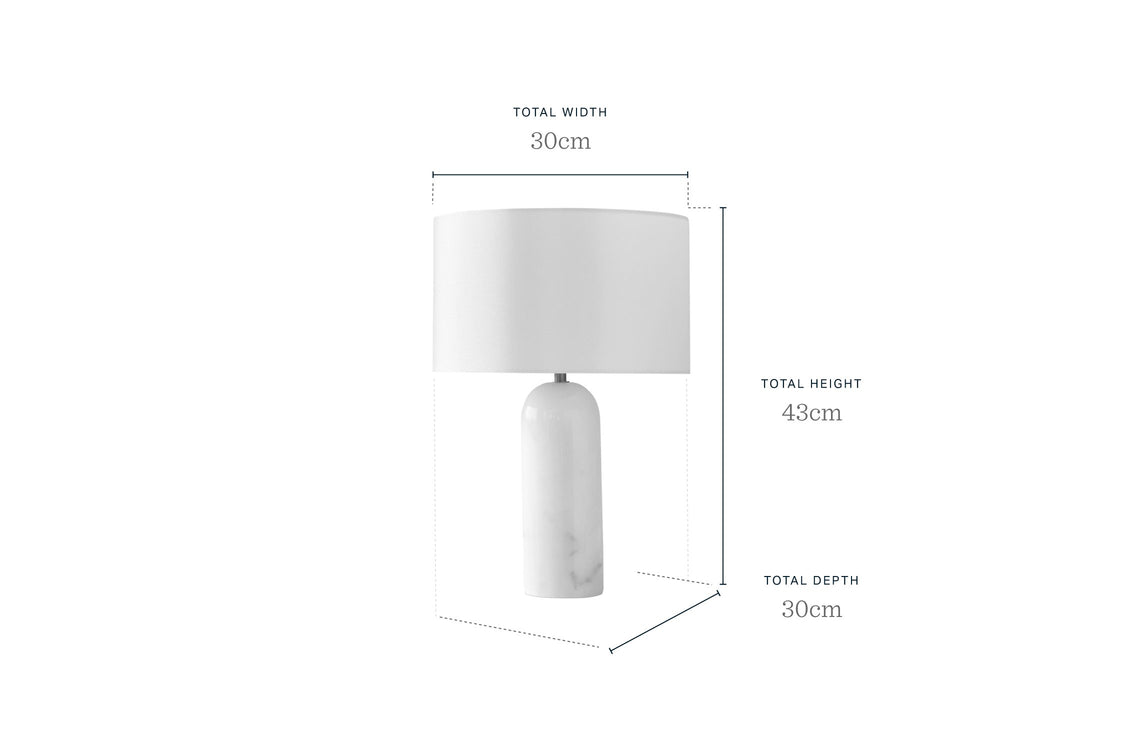Elegant modern table lamp with a white marble base and a cylindrical cream fabric shade.