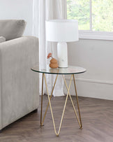 Round glass-top side table with slender gold-finished metal legs in an X-frame design, positioned next to a light grey sofa, with a large white lamp and small decorative items atop, in a room with a window, white curtains, and wooden flooring.