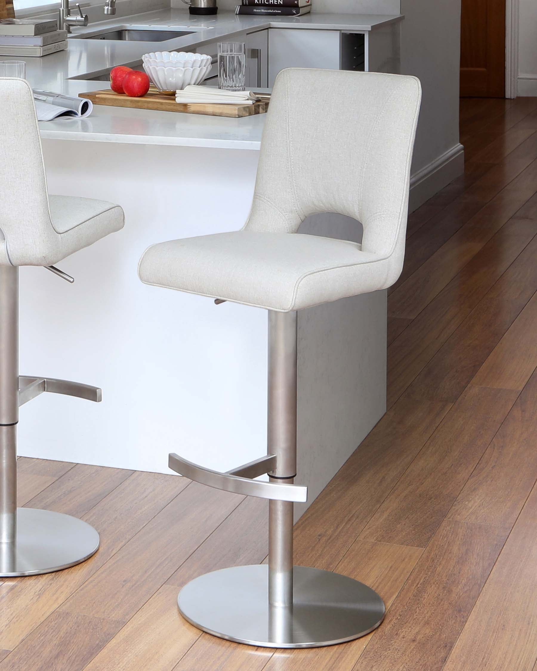 The Ludo champagne fabric gas lift bar stool brings sophisticated comfort to your kitchen island or breakfast bar. Upholstered in soft chenille fabric with a warm champagne tone, this adjustable stool features a cushioned seat and curved backrest with distinctive cutout detail. The smooth gas lift mechanism adjusts from counter to bar height, while the 360-degree swivel adds effortless functionality.