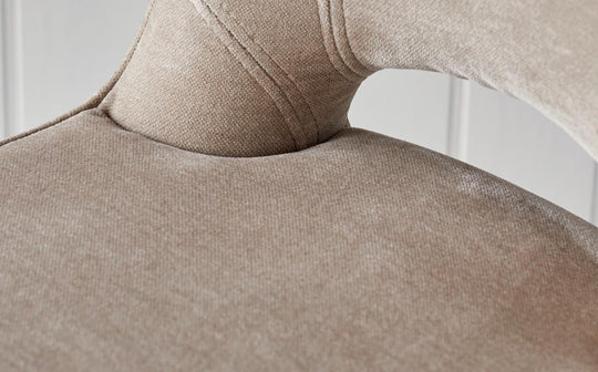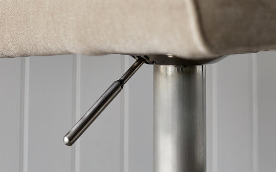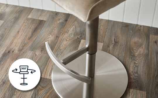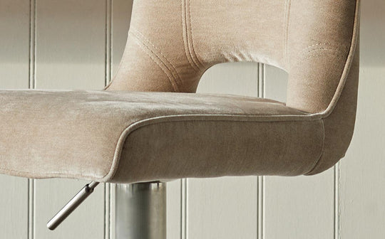 The Ludo champagne fabric gas lift bar stool brings sophisticated comfort to your kitchen island or breakfast bar. Upholstered in soft chenille fabric with a warm champagne tone, this adjustable stool features a cushioned seat and curved backrest with distinctive cutout detail. The smooth gas lift mechanism adjusts from counter to bar height, while the 360-degree swivel adds effortless functionality.
