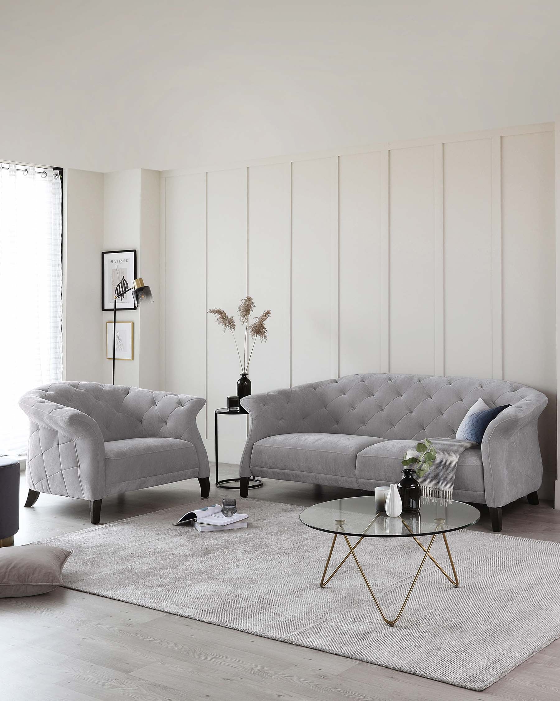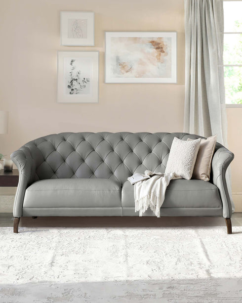 A stylish, grey tufted sofa with a neutral and plum cushion adds a touch of elegance to any living space.