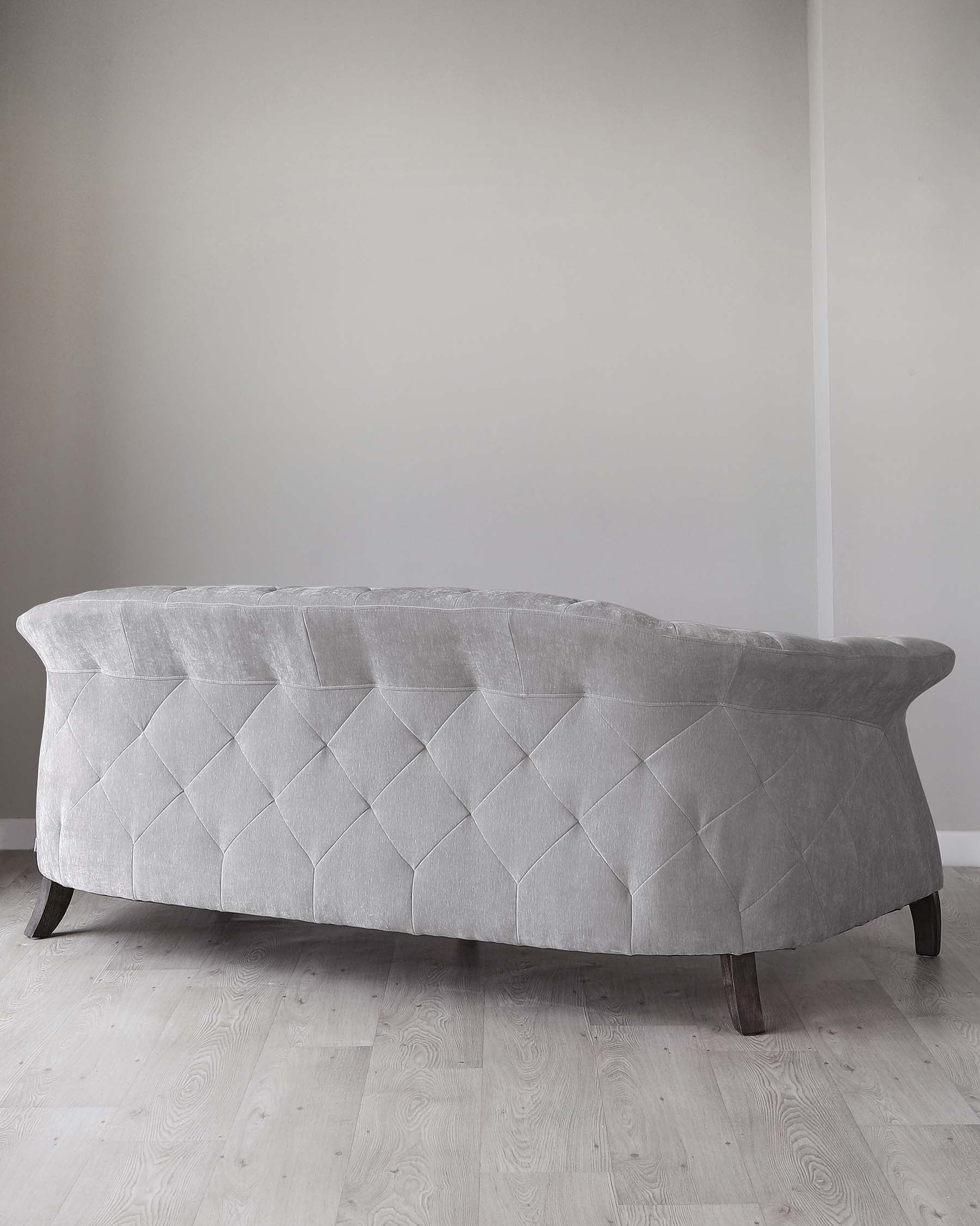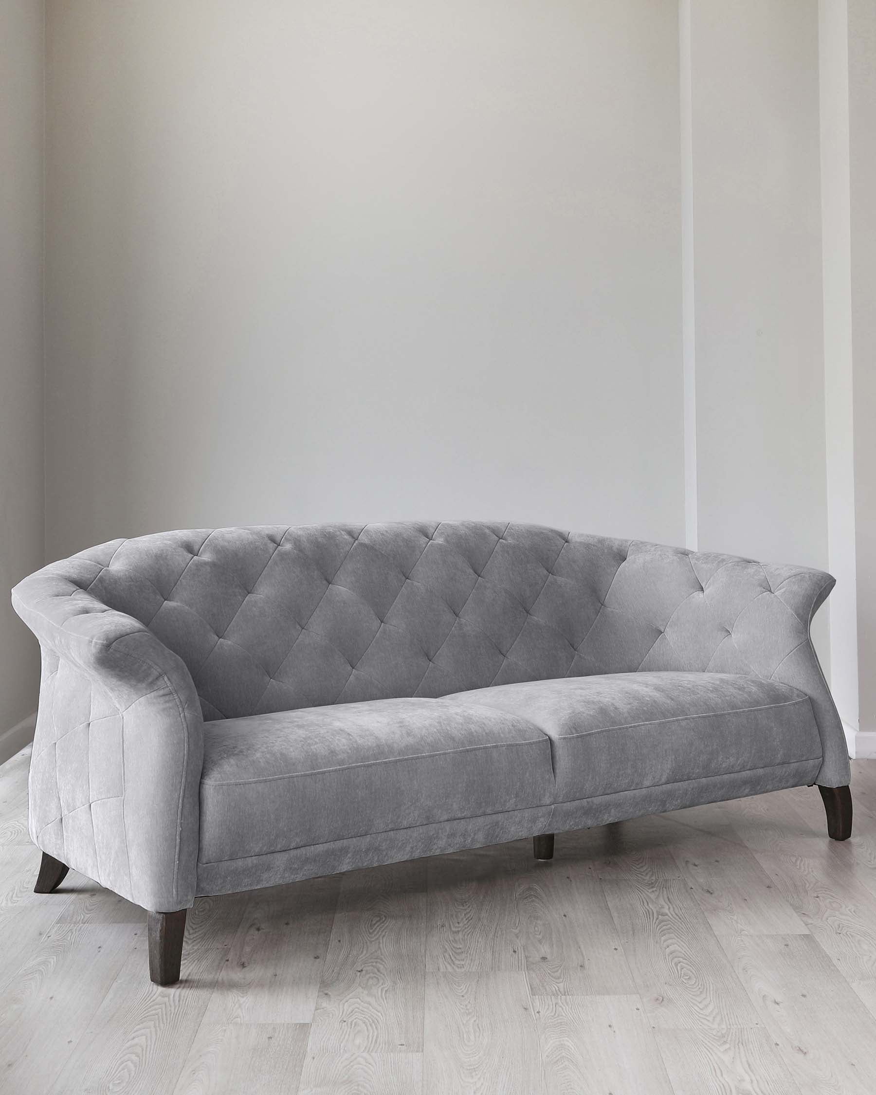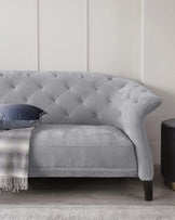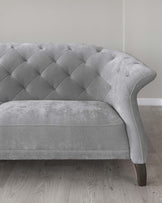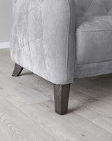 Close-up of a grey, button-backed sofa with a textured finish and wooden legs, against a neutral backdrop.