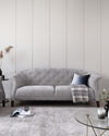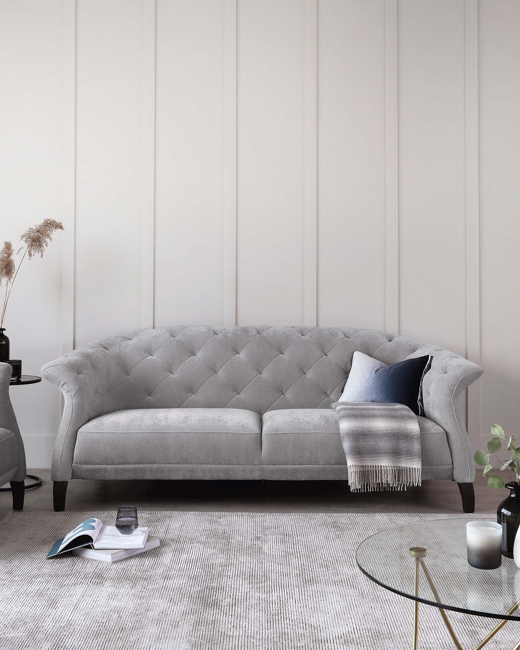 A grey Chesterfield sofa with a throw. The sofa is in a bright living room with a marble table and layered ceiling light.