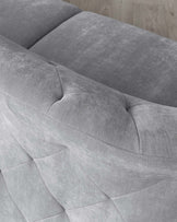Close-up of a grey, diamond-tufted headboard, upholstered in a soft fabric. Showing the depth and texture of the material.