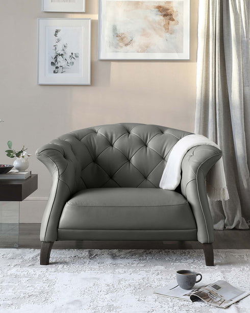 Close-up of a grey leather armchair with buttoned detailing and visible wooden leg. Subtle lighting from nearby window.