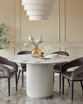 Round marble dining table with velvet chairs and a tiered pendant light. Contemporary dining room furniture.