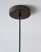 A ceiling light with a dark metal canopy and a black cord, providing a minimalist and modern lighting solution.