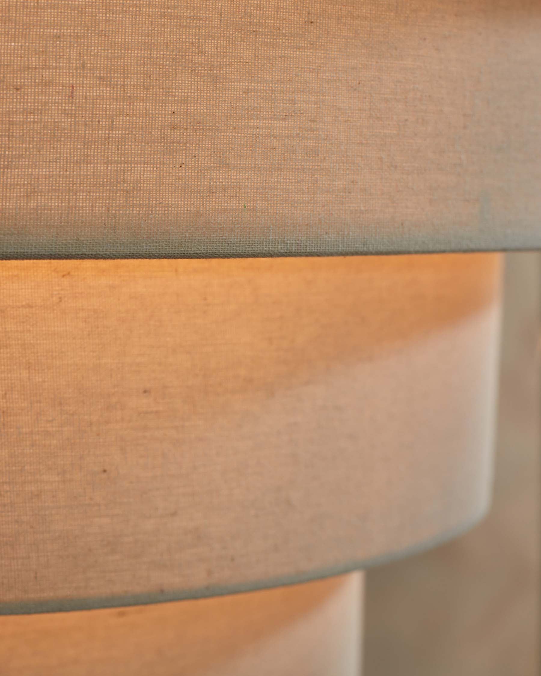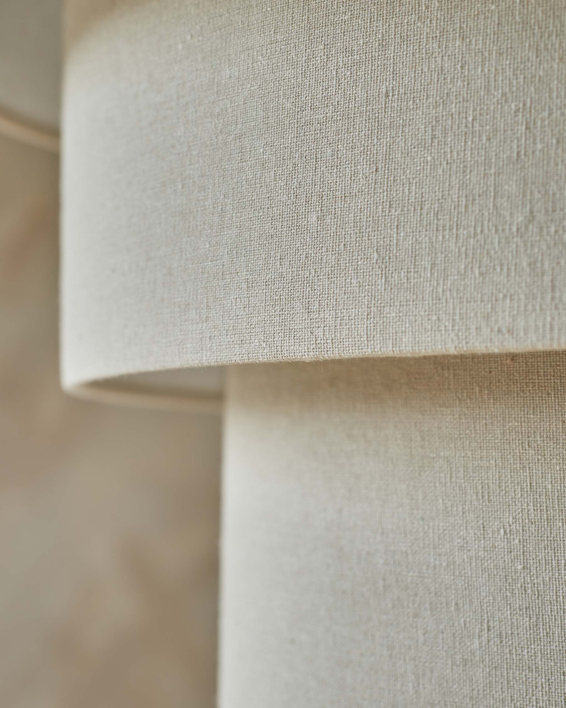 Close-up of a tiered lampshade featuring a neutral-toned woven linen texture.