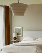 A beige, tiered pendant light hangs from the ceiling, creating a soft and warm ambience within the room.