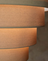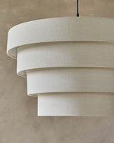 Close-up of a four-tiered, beige fabric lampshade hanging from the ceiling, showcasing a minimalist design and neutral colour palette.