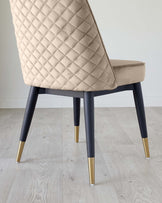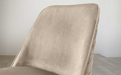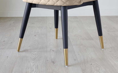 The Mae champagne velvet dining chair brings instant glamour to your dining space. With its eye-catching quilted backrest and sumptuous velvet upholstery, these chairs make every meal feel like an occasion. Black ash wood legs capped with brushed brass details add contemporary sophistication, while the cushioned seat ensures comfort through long dinner parties. Sold in pairs for coordinated style.