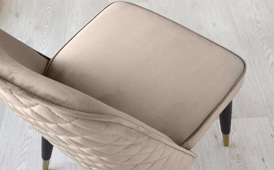 The Mae champagne velvet dining chair brings instant glamour to your dining space. With its eye-catching quilted backrest and sumptuous velvet upholstery, these chairs make every meal feel like an occasion. Black ash wood legs capped with brushed brass details add contemporary sophistication, while the cushioned seat ensures comfort through long dinner parties. Sold in pairs for coordinated style.