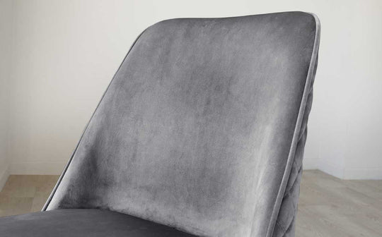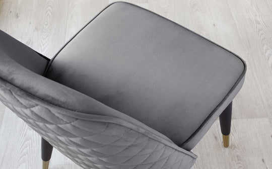 Effortlessly sophisticated, the Mae dark grey velvet dining chair brings luxurious comfort to every gathering. The eye-catching quilted backrest creates visual interest, while plush velvet upholstery invites lingering conversations over dinner. Sleek black ash wood legs with brushed brass caps add a contemporary edge that works beautifully in both modern and classic dining spaces.