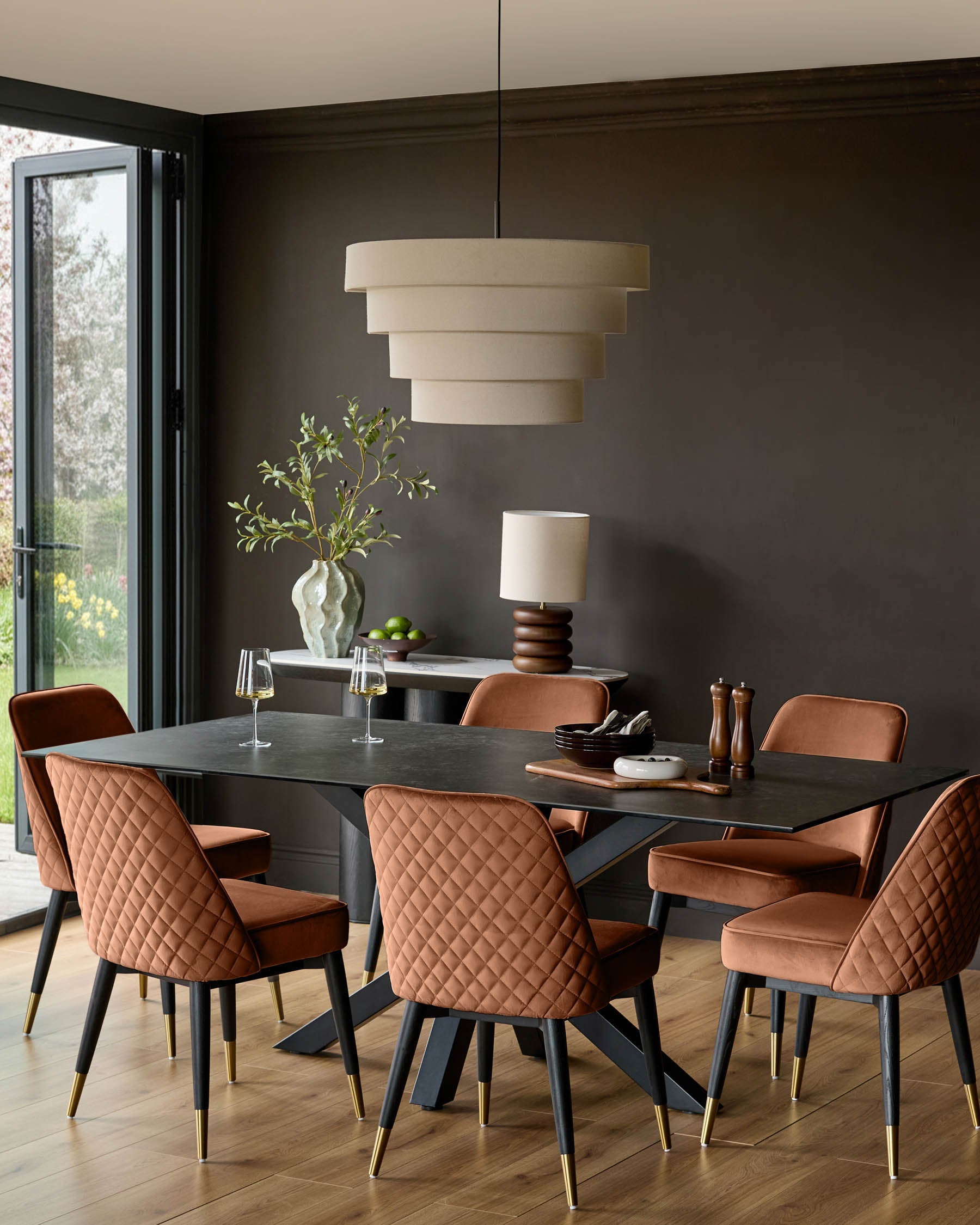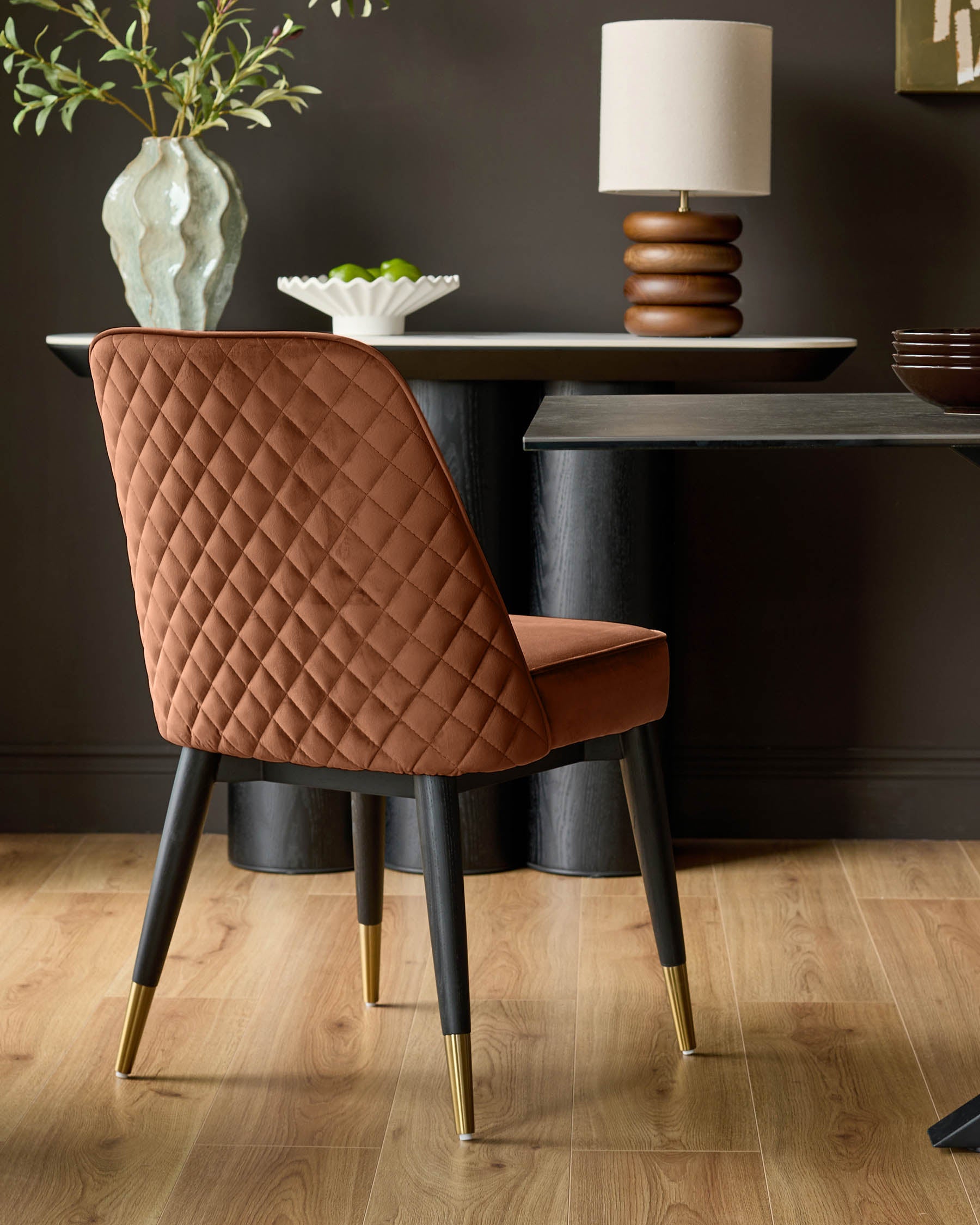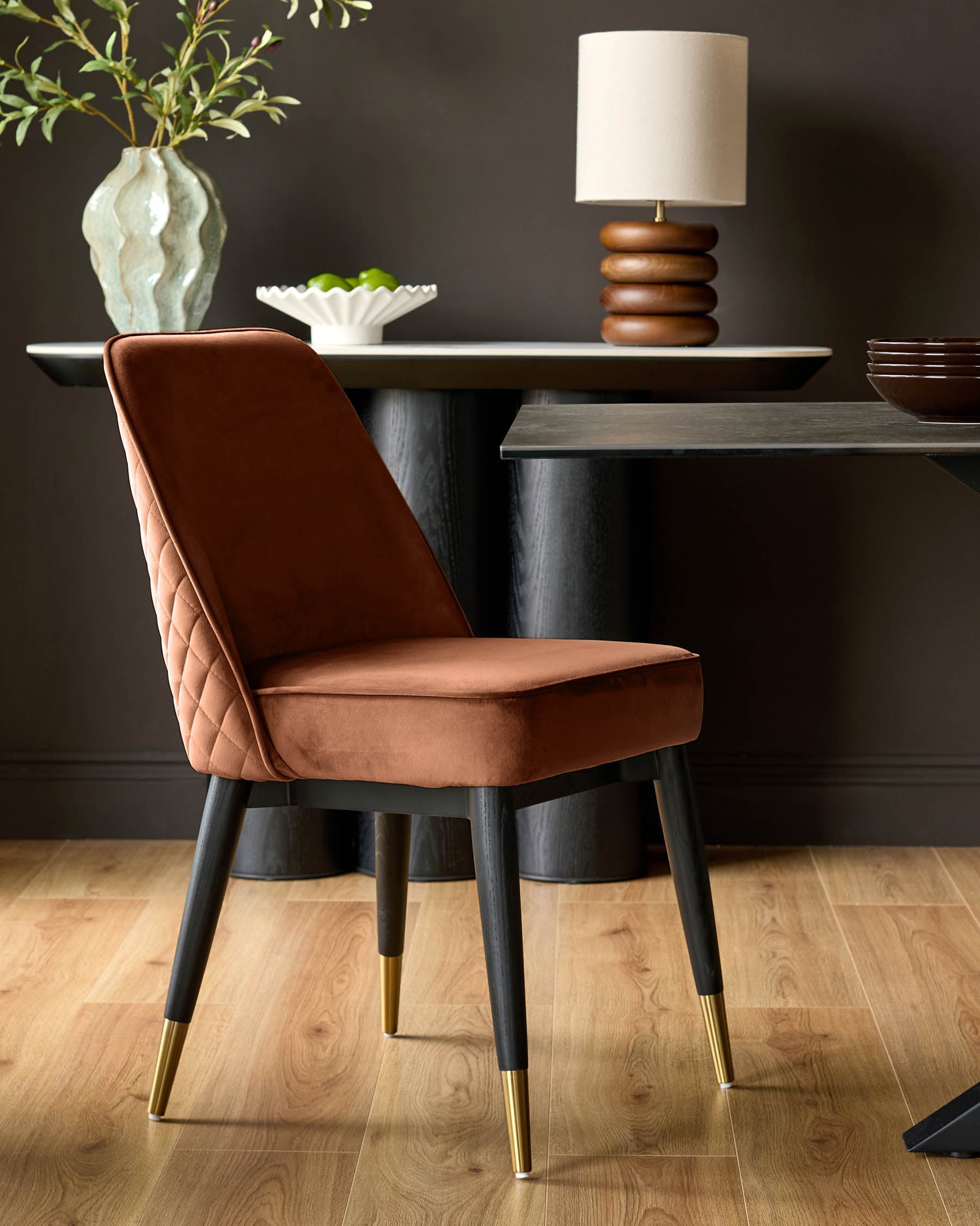 The Mae rust velvet dining chair brings a rich warmth to your dining space with its eye-catching quilted backrest and sumptuous velvet upholstery. The diamond-patterned quilting creates sophisticated texture, while black ash wood legs capped with brushed brass details add contemporary flair. Perfect for long dinner parties or quick weekday meals, the cushioned seat ensures everyone stays comfortable.