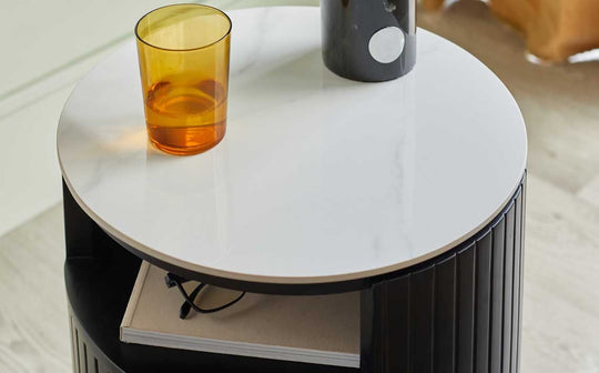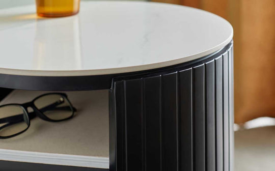 The Malachy side table brings sculptural style to any corner of your home. Its white ceramic top delivers the luxurious look of marble with everyday durability, while the ribbed black wood base adds contemporary texture and visual interest. An integrated shelf keeps books and essentials within easy reach, making this versatile piece perfect for living rooms, bedrooms or hallways.