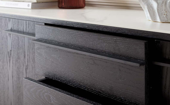 The Manhattan large sideboard brings sophisticated storage to your dining room or living space. With its luxurious marbled ceramic top, sleek black ash finish and gently rounded silhouette, this piece combines contemporary style with practical function. Behind the doors, adjustable shelves adapt to your storage needs, while the spacious surface provides the perfect stage for decorative displays.