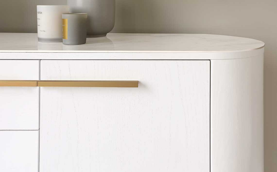 The Manhattan large sideboard brings sophisticated storage to contemporary homes with its striking marbled ceramic top and warm white oak base. This generously proportioned piece features soft-close doors and drawers that open to reveal adjustable shelving, offering flexible organisation for dining essentials or living room treasures. Sleek brass legs add a refined finishing touch to this versatile design.