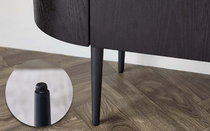 Elegant black wood grain sideboard with curved front, featuring two doors and slender metal legs.