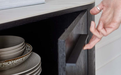 The Manhattan small sideboard combines sleek black ash with luxurious marble ceramic for a piece that's both practical and striking. With its curved silhouette and rounded corners, this compact storage solution fits perfectly in hallways, living rooms or dining spaces. Two doors open to reveal adjustable shelving, offering versatile storage for dinnerware, linens or everyday essentials.