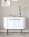 Elegant modern white curved sideboard with gold-coloured tapered metal legs and matching gold handles.